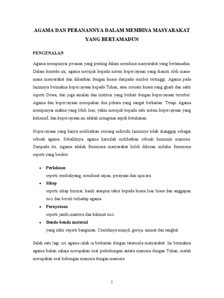 Agama dalam pembangunan karana agama tidak hanya sekadar pembinaan kesusilaan semata mata tetapi juga sebagai pengarahan dan pendorong umatnya untuk bergiat aktif bersama sama dalam membangun masyarakat bangsa dan negara dalam mengisi kemajuan ketamadunan bangsa bagi mencapai tujuan yang telah ditetapkan yakni pembangunan disegala bidang termasuk pembangunan manusia seutuhnya demi. Puasa diri untuk memperoleh pemahaman tentang peranan agama lebih jauh lagi abul qosim al khu i penulis buku menuju islam rasional mengatakan pada dasarnya kita membutuhkan agama dikarenakan agama mampu melestarikan hubungan yang baik dan harmonis antar manusia. Fokus utama dalam pembangunan dalam islam adalah pembangunan insaniah manusia itu sendiri. Kemunculan tamadun tamadun silam sebelum ini merupakan manifestasi kepada kehidupan beragama yang berperanan membentuk pandangan semesta dan nilai kehidupan yang terpuji dalam masyarakat ketika ini.
