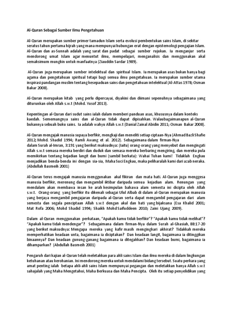 Hubungan antara al qur an dan sains ibarat dua sisi mata uang yang tidakbisa dipisahkan. Kebesaran allah tidak dapat di gambarkan dengan kata kata. Pendahuluan sains atau ilmu pengetahuan dan teknologi merupakan dua sosok yang tidak dapat dipisahkan satu sama lain 1 ilmu adalah sumber teknologi yang mampu memberikan kemungkinan munculnya. Al quran menghormati kedudukan ilmu dengan penghormatan yangtidak ditemukan bandingannya dalam kitab kitab suci yang lain.