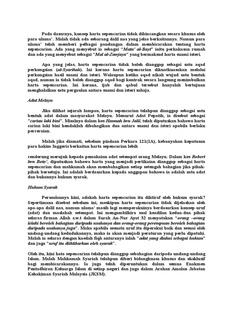 Arahan amalan mahkamah syariah harta sepencarian. Malah mahkamah syariah telahpun diberi bidangkuasa khusus dan eksklusif bagi membicarakannya. Ia juga telah diperuntukan dalam semua enakmen pentadbiran keluarga islam di setiap negeri dan juga dalam arahan amalan jabatan kehakiman syariah malaysia jksm. Masa dibolehkan membuat tuntutan harta sepencarian. Kuasa mahkamah memerintah pembahagian harta sepencarian.