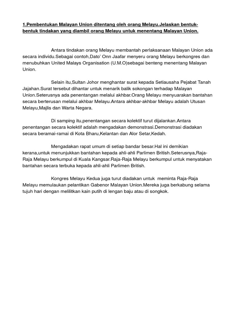 Bentuk bentuk tindakan orang melayu menentang malayan union. Terangkan faktor orang melayu menentang pelaksanaan malayan union pada tahun 1946 di tanah melayu. Menyatupadukan orang melayu untuk menghadapi segala dan apa jua kemungkinan dari rancangan inggeris menubuhkan malayan union. 6 markah kesimpulannya tindakan yang kemas telah dilancarkan melalui umno. Terdapat banyak tindakan yang telah diambil oleh orang melayu untuk menentang malayan union iaitu.