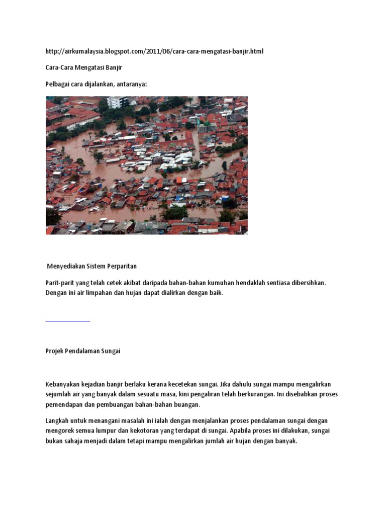 Cara mengatasi masalah banjir kilat. 10 penyebab banjir akibat dan cara mengatasi banjir. Banjir merupakan suatu kondisi di mana terjadi luapan air yang berlebih yang mengakibatkan terendamnya suatu wilayah. Bagi menangani masalah ini kesedaran kepada masyarakat perlu didedahkan supaya aktiviti negatif ini tidak terus dilakukan seperti mengadakan kempen mencintai sungai dan sebagainya. Melalui cara ini jumlah aliran air ke dalam sungai sungai dapat dikawal dari masa ke masa justeru dapat mengelak kejadian banjir terutamanya di kawasan hilir sungai.