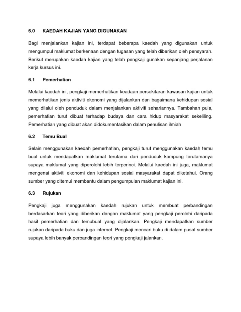 Kaedah rujukan maklumat yang dikumpul mestilah berguna untuk menulis laporan kajian. Dapatan kajian 10 7. Kaedah pemerhatian bagi tugasan 1 bentuk muka bumi pula kita boleh guna cara pemerhatian. Calon mesti melaksanakan semua aspek tugasan mengikut format penulisan yang ditetapkan.