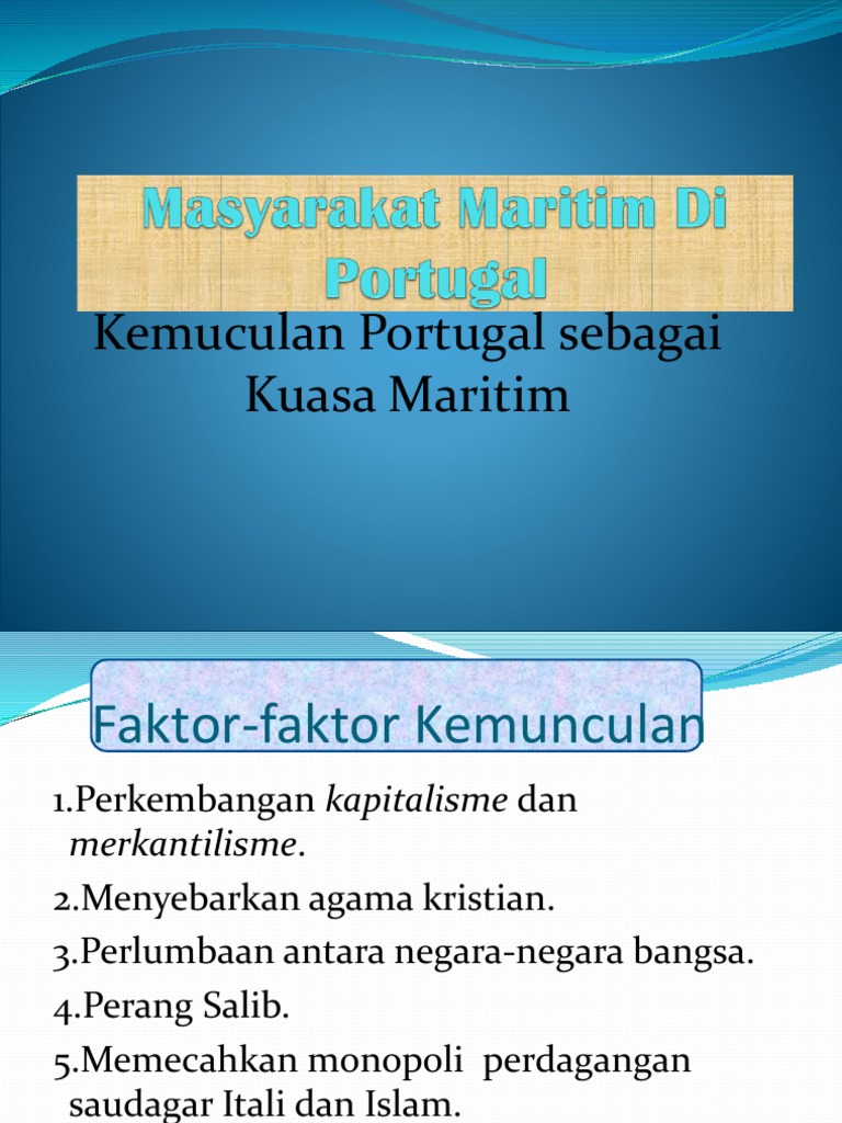 F1 kegiatan ekonomi berasaskan perdagangan kelautan. Lokasi di pesisiran pantai portugal merupakan kerajaan pertama di eropah mula menjalankan penerokaan tanah baru yang serius melalui aktiviti pelayaran ke dunia luar. Ciri ciri masyarakat maritim portugal 1. Kerajaan maritim terletak di persisiran pantai dan masyarakatnya menjalankan kegiatan yang berkaitan dengan laut seperti perdagangan.