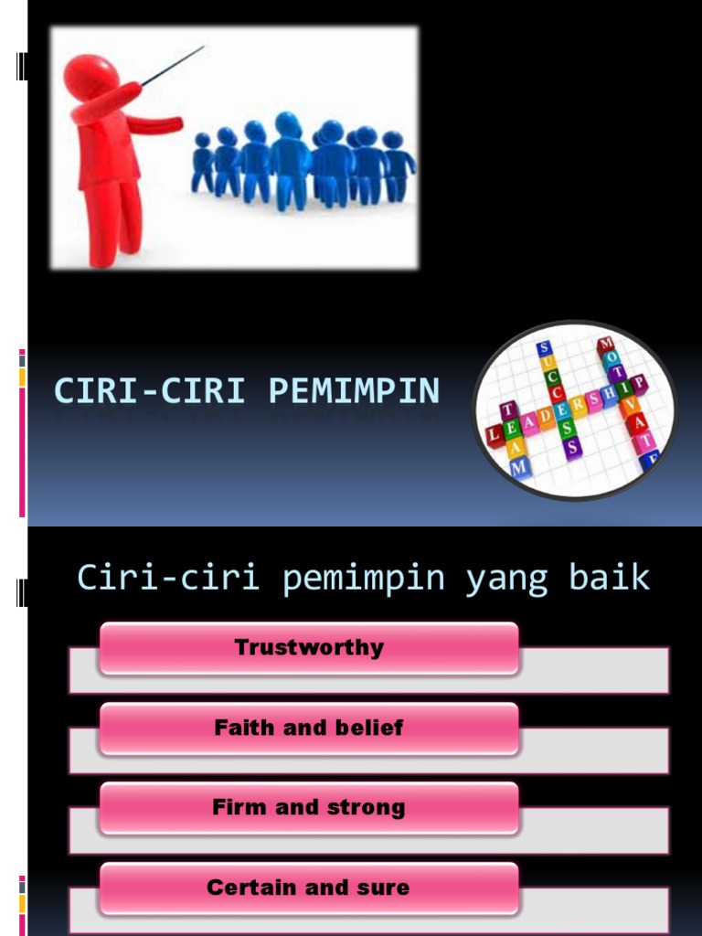 Lantas seperti apa pemimpin yang baik itu. Ciri ciri pemimpin yang baik kejayaan sebuah organisasi bergantung ke atas prestasi kolektif pentadbirnya yaitu orang yang mengarah kerja dan memimpin kakitangan keseluruhannya. Bisa berkomunikasi yang baik adalah modal utama yang harus dimiliki seorang pemimpin. Seorang pemimpin memiliki komunikasi yang baik pemimpin memiliki komunikasi yang baik.