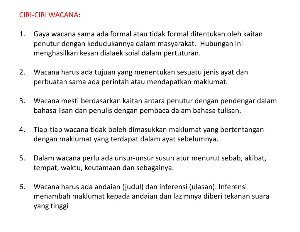 Ciri ciri wacana wacana mempunyai tujuh ciri iaitu perlu dikaji kaitan penutur dengan masyarakat sekitarnya. Terdapat beberapa sebuah ciri ciri dalam wacana diantaranya ialah. Mempunyai sebuah hubungan kohesi. Manakala mohd rashid md idris 2004 telah membahagikan ciri wacana kepada koheren kohesi tujuan maklumat diterima hubungan andaian dan inferen gaya dan maklumat tidak berlawanan.