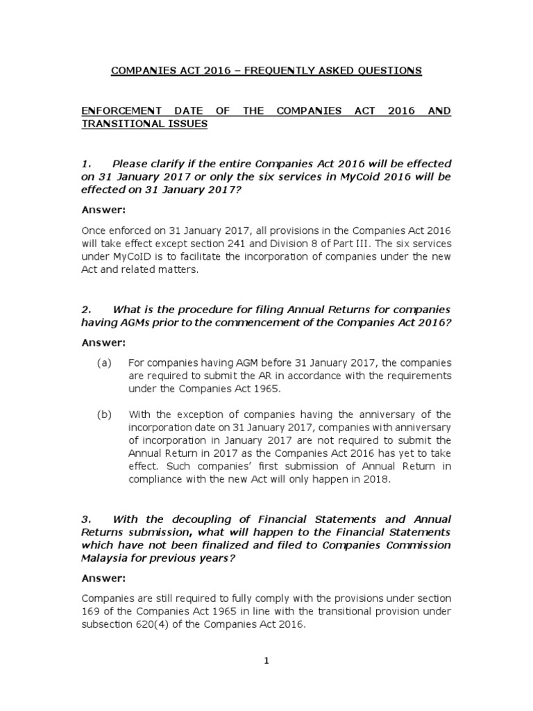 1 this act may be cited as the companies act 2016. The companies act 2016 act came into force on 31 january 2017 save for section 241 in relation to the requirement of a secretary to register with the registrar and division 8 of part iii in relation to corporate rescue mechanism the act replaced the companies act 1965. The companies act 2016 ca 2016 repealed the companies act 1965 ca 1965 and changed the landscape of company law in malaysia. 79 of 1965 date of coming into operation.