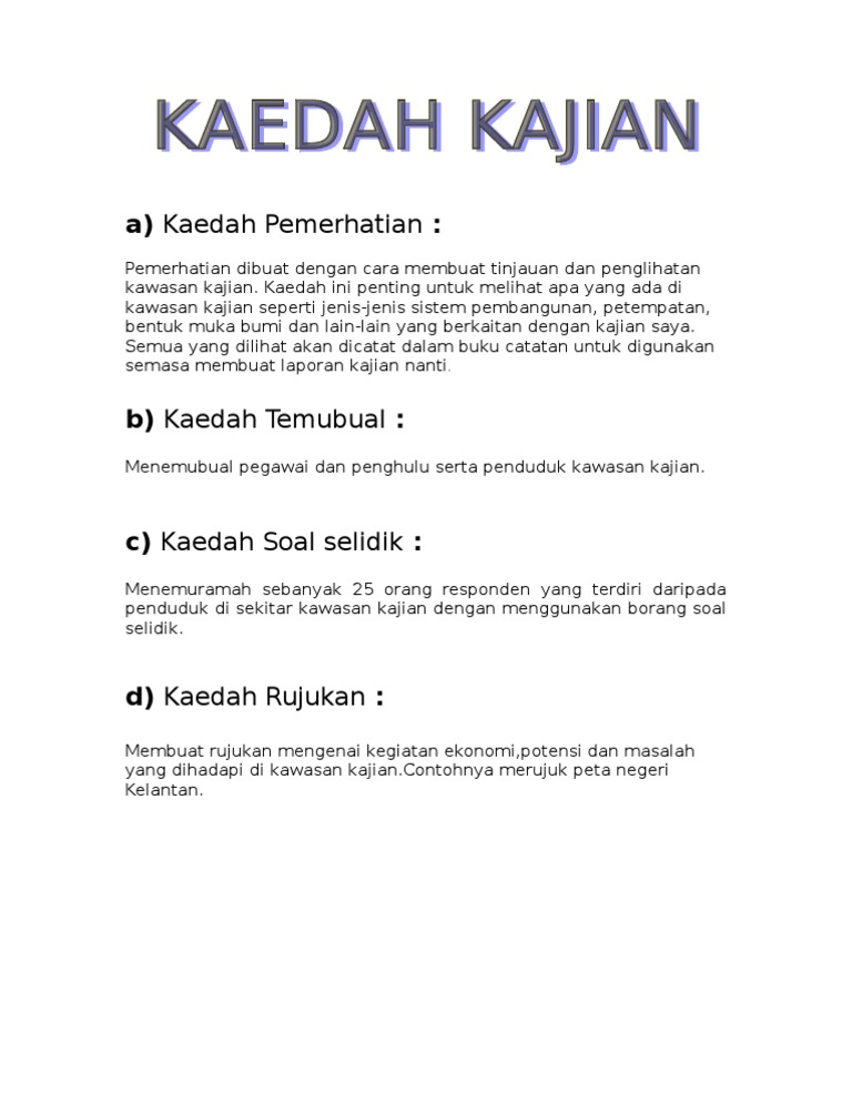 Contoh kaedah kajian geografi soal selidik. Borang kaji atau soal selidik ini perlu dibuat dalam perlaksanaan dan disertakan dalam pelaporan tugasan wajib bagi ujian pelbagai instrumen geografi pentaksiran tingkatan 3 pt3 kajian lapangan atau lebih dikenali sebagai kerja kursus agar menjelaskan lagi hasil dapatan dan maklumat yang diperoleh itu menjadi info tentang kawasan kajian. 5 2 temu bual saya telah menemu bual beberapa orang penduduk ss19 untuk mendapatkan maklumat maklumat untuk kajian saya. Sikap terbuka mereka telah memudahkan kajian ini dan membolehkan saya menyiapkan dalam masa yang di tetapkan. Post menarik semakan keputusan pidn 2016 melalui pemerhatian.