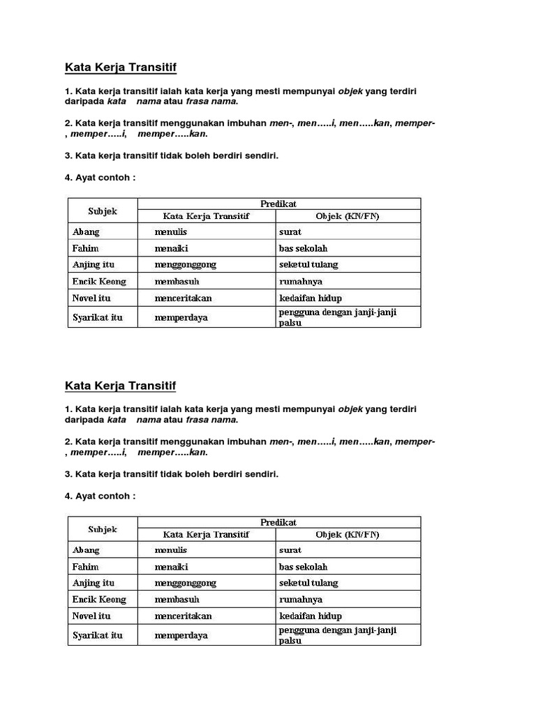 Selepas kata kerja transitif jangan letak kata sendi atau kata hubung. Kata ini biasanya dipakai sebagai predikat dalam suatu pola kalimat dasar kata kerja sendiri terbagi menjadi beberapa jenis di mana salah satu diantara jenis jenis kata kerja tersebut adalah kata kerja transitif. Kata kerja tersebut merupakan kata kerja yang mesti diikuti objek di belakangnya. Contoh kata kerja akan dibagi menjadi contoh kata kerja transitif dan kata kerja intransitif.