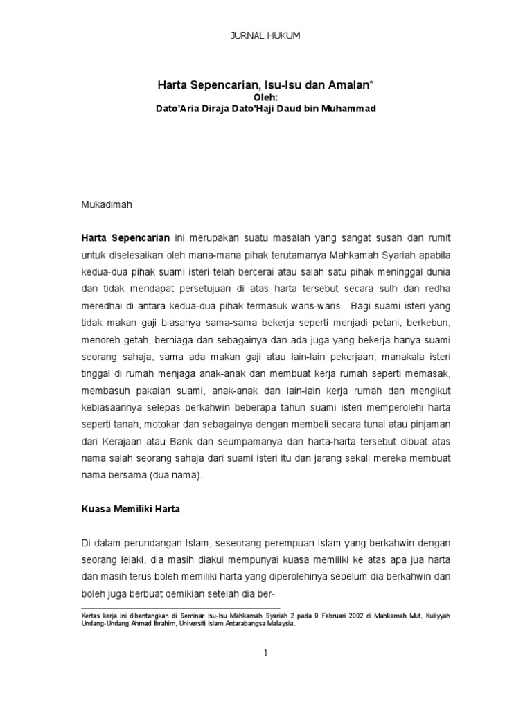 Di malaysia tuntutan harta sepencarian diiktiraf oleh undang undang keluarga islam di setiap negeri dan boleh dituntut dengan sebab berlakunya perceraian poligami atau kematian. Abstrak di malaysia tuntutan harta sepencarian diiktiraf oleh undang undang keluarga islam di setiap negeri dan boleh dituntut dengan sebab berlakunya perceraian poligami atau kematian. Bagaimanakah menentukan kadar pembahagian harta sepencarian. Secara sulk melalui cara pengakuan dan penyerahan hak kepada pihak pasangan.