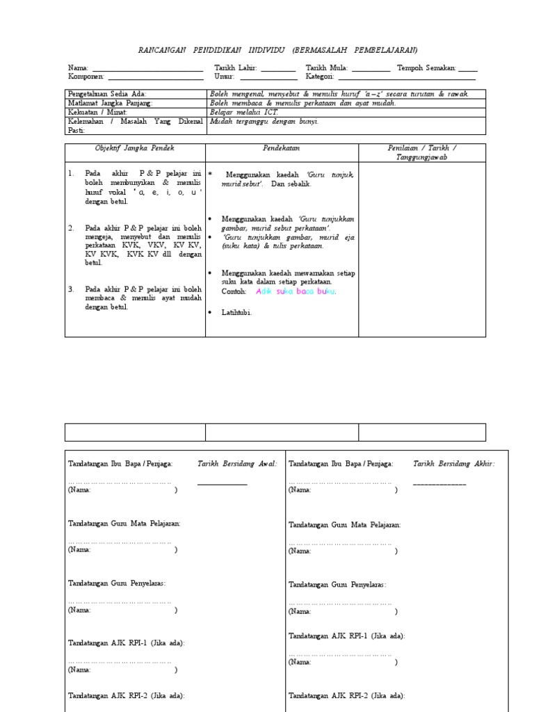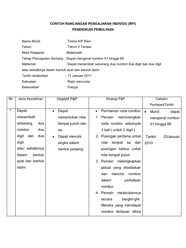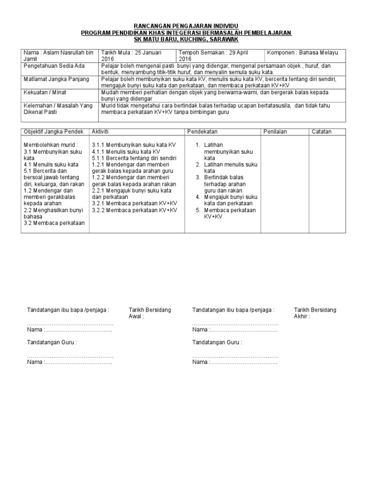 Muhd kamarulzaman bin jamaludin tarikh lahir. Tips dan cara menulis objektif rancangan pendidikan individu rpi atau nama inggerisnya individual education plan iep untuk murid berkeperluan khas. Rancangan pengajaran individu program pendidikan khas integrasi bermasalah pembelajaran sk jalan semenyih 2 kajang selangornama. Pelaksanaan kurikulum pendidikan khas bermasalah pembelajaran sekolah rendah dan sekolah menengah para 5 menyebut bagi memastikan keberkesanan kurikulum ini kurikulum alternatif rancangan pendidikan individu rpi setiap murid hendaklah disediakan.