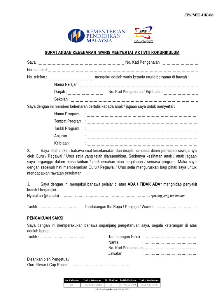 Contoh surat pemberitahuan kepada ibu bapa penjaga. Memastikan tiap tiap ahli memiliki buku rekod kegiatan kokurikulum dan menyerahkannya kepada setiausaha kokurikulum pada penghujung penggal untuk semakan. Surat kebenaran aktiviti kokurikulum dan pendidikan jasmani ini dikongsi susulan pelaksaanaan aktiviti kokurikulum dan sukan yang telah dibenarkan untuk dilaksanakan semula di sekolah sekolah selaras dengan garis panduan pelaksanaan aktiviti sukan dan kokurikulum yang dikeluarkan oleh kementerian pendidikan malaysia. Mengupaya jpn ppd dan sekolah untuk menyediakan.