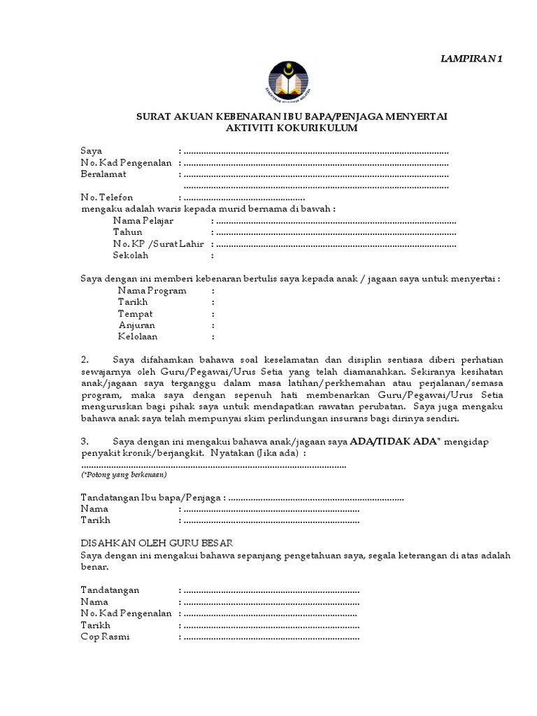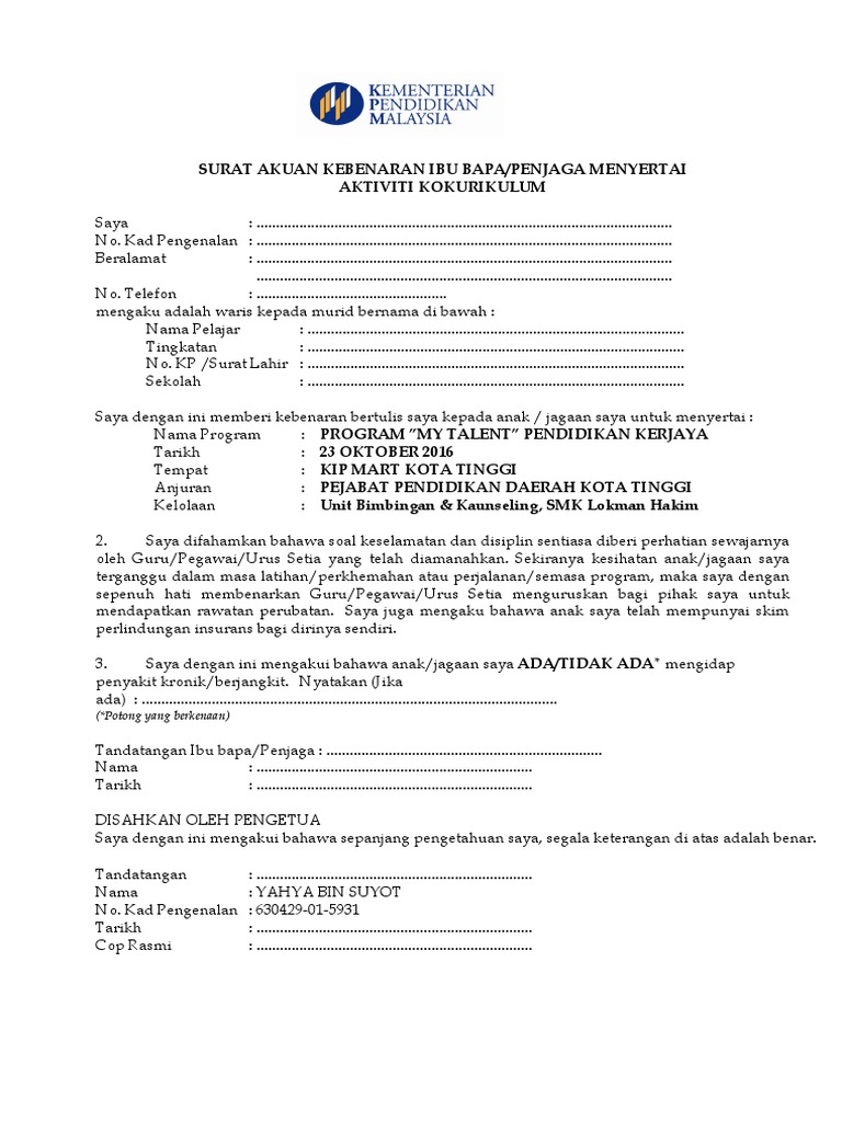 Beberapa contoh surat makluman aktiviti kokurikulum kepada ibu bapa terbaru 2019. Surat akuan kebenaran waris menyertai aktiviti kokurikulum saya no kad pengenalan. Memanfaatkan ict bagi meningkatkan kualiti. Dengan ini memberi pengakuan bahawa saya membenarkan anak saya anak jagaan saya seperti nama tersebut diatas untuk menyertai aktiviti.