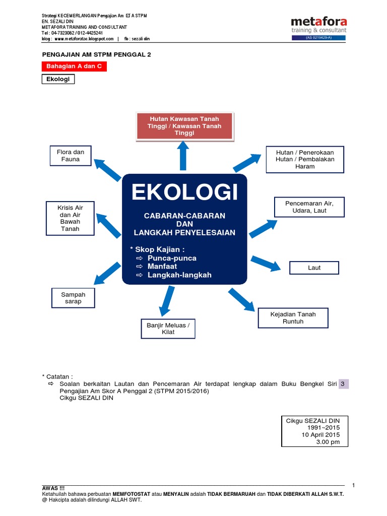 Koleksi karangan esei pengajian am pa stpm 1 sijil tinggi persekolahan malaysia. Salah satu inisiatif celik ekologi yang sedang berjalan di peringkat negara iaitu sekolah lestari anugerah alam sekitar yang dianjurkan bersama jabatan alam sekitar jas kementerian pelajaran dan institut alam sekitar dan pembangunan lestari universiti kebangsaan malaysia ukm mengetengahkan konsep celik ekologi melalui pemupukan budaya penjagaan alam sekitar di kalangan warga sekolah. You are pleased to drop a like and enjoy the video. Memajukan sumber manusia dan mewujudkan tenaga kerja yang berdisiplin dan produktif.