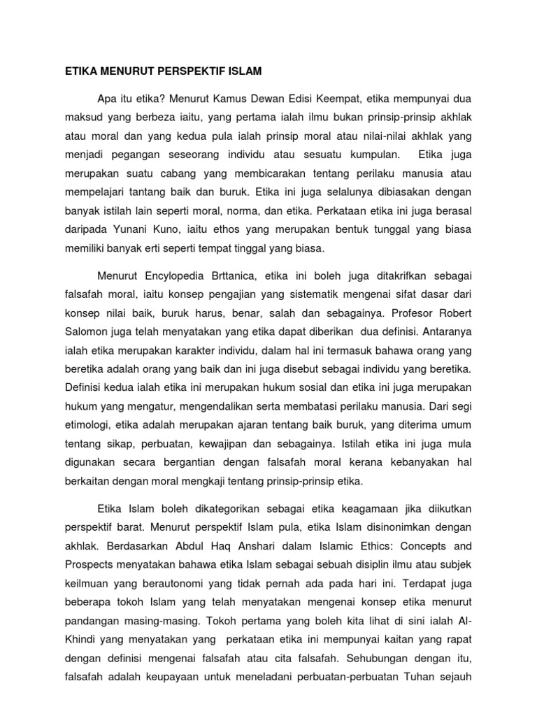 Etika perniagaan yang dituntut dalam islam. Islam mengharamkan mafa sid dalam kegiatan perniagaan kerana ia jelas boleh memberikan kesan yang negatif terhadap pencapaian dharuriyah ia itu dalam memelihara kelima lima perkara di atas. Pinjaman diberi kepada individu dan syarikat pada kadar faedah. Pokok dasar etika islam tercantum dalam alqur an seperti firman allah dalam al qur an surat al qalam ayat 4 dan ali imran ayat 104 yang bunyinya sesungguhnya engkau muhammad berada di atas budi pekerti yang agung. Kedua dua ayat ini menjelaskan bahawa penipuan daripada segala segi adalah haram dalam etika.