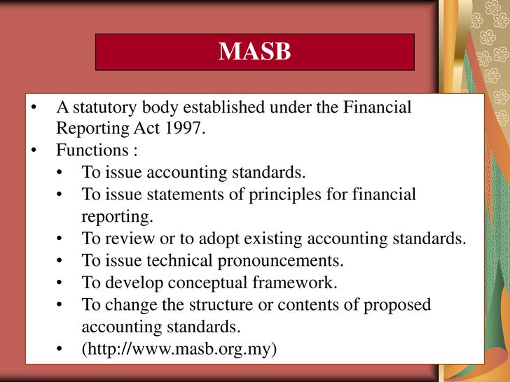 The masb was established under the financial reporting act 1997 as an independent authority to develop and issue accounting and financial reporting standards in malaysia. This act may be cited as the financial reporting amendment act 2004. Accounting standards are issued by the malaysian accounting standards board masb by virtue of the power conferred by the financial reporting act 1997. The financial reporting act 1997 act 558 which is referred to as the principal act in this act is amended in section 2.