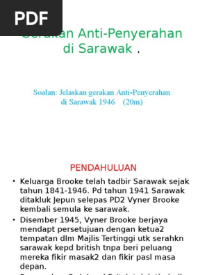 Keluarga brooke memerintah sarawak dari tahun 1841 sehingga 1941. 1 gerakan anti penyerahan di sarawak. Gerakan anti penyerahan sarawak adalah gerakan di sarawak yang menentang upaya britania untuk memerintah sarawak sebagai koloni mahkota dan bukan sebagai protektorat yang dipimpin oleh rajah putih pergerakan ini berlangsung dari 1 juli 1946 hingga maret 1950. Pra u teks stpm penggal 3 bandar baru bangi penerbitan pelangi sdn.