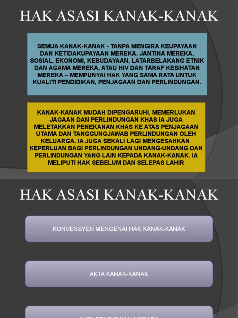 This video is unavailable. Hak boleh didefinasikan sebagai sesuatu yang adil dan saksama yang boleh dimiliki atau dilakukan oleh seseorang. Kanak kanak berhak mendapat pendidikan penjagaan kesihatan perlindungan dan sebagainya. Pemimpin dan masyarakat memainkan peranan penting dalam memelihara hak asasi kanak kanak.