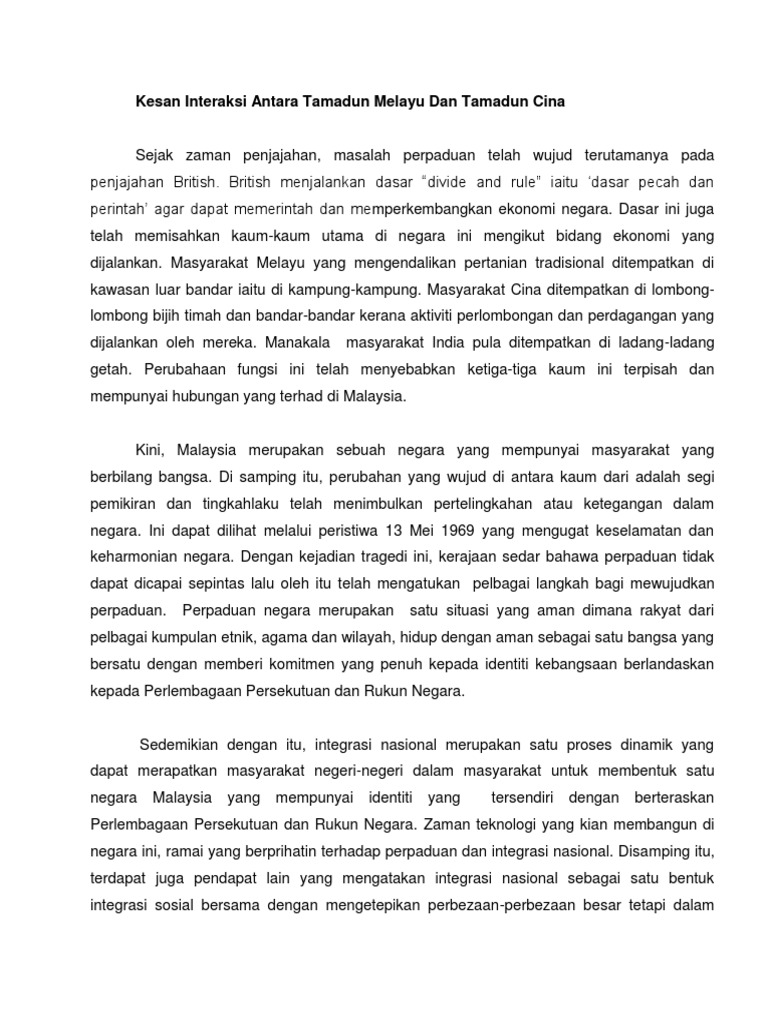 Akhir kata isu interaksi antara kaum merupakan isu yang penting bagi melahirkan satu negara yang berdiri di bawah satu paksi perlembagaan dan rukun negara yang maju dan disegani oleh dunia. Antara cabaran permasalahan cara kemasukkan imigran cina ke tanah melayu kesan kedatangan imigran cina india ke tanah melayu sistem pengambilan kakitangan sistem pengambilan rumah kongsi sistem tiket kredit budaya kongsi gelap pengaruh. Selain daripada itu para pegawai ini juga boleh digalakkan untuk menyertai seminar persidangan dan program latihan di beberapa pusat bandar. Konsep hubungan kaum konsep hubungan kaum berkaitan dengan interaksi di kalangan kelompok kaum dalam satu jangka masa tertentu.