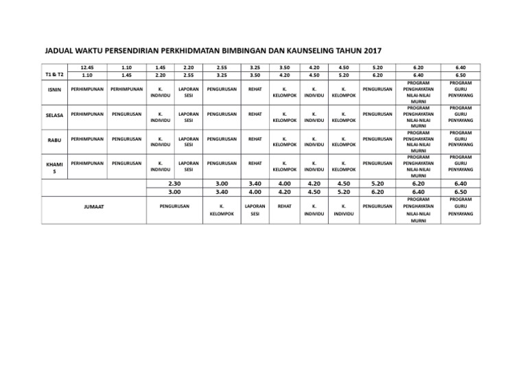 Guru kaunseling akan membina jadual waktu mereka sendiri mengikut keperluan sekolah masing masing. Wahai diriku hal hal yang tidak penting tidak boleh mengganggu aku hal hal yang tidak berguna aku letakkan aku lepaskan. Assalamualaikum w b t dan salam sejahtera tulisan di bawah adalah bagi pelajar yang ada jadual belajar peribadi tetapi susah nak ikut sumber.