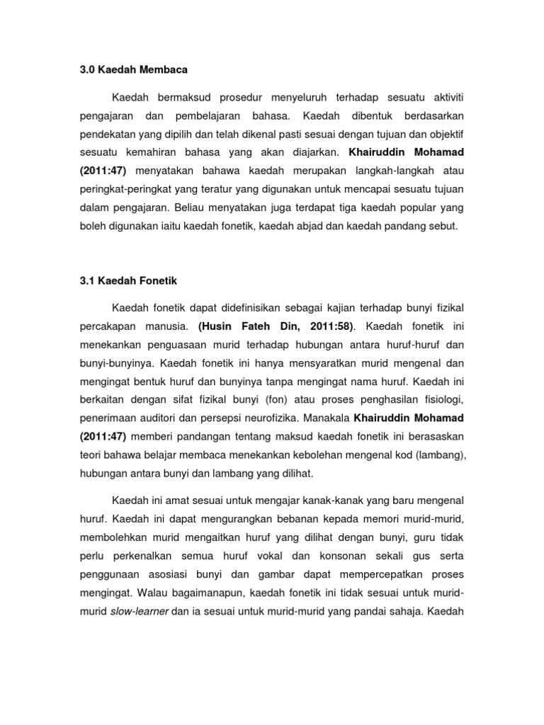 Kaedah pengajaran kemahiran membaca yang digunakan dalam rph kami ialah kaedah pandang sebut dan kaedah abjad yang digunakan dalam langkah 1 2 dan 3. Sabran dan rahim syam 1985 menerusi buku yang bertajuk kaedah pengajaran bahasa melayu menyatakan bahawa kaedah abjad merupakan kaedah yang sering kali digunakan oleh guru dalam pengajaran kemahiran membaca di sekolah. Sesuatu bahan dapat dibaca oleh pelajar dengan pelbgai kaedah berdasarkan kemampuan mereka dan tahap penguasaan kemahiran membaca mereka serta sejauh manakah kompleknya bahan bacaan yang dibaca. Kaedah membaca kaedah bunyi fonik kaedah bunyi fonik.