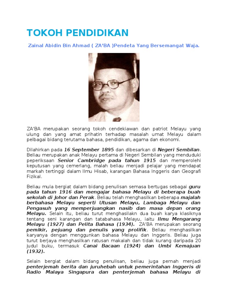 Pendeta tan sri dr. Tidak lama selepas itu beliau bertukar ke sekolah melayu linggi untuk mendalami pengajian arab. Za ba atau nama sebenarnya ialah zainal abidin bin ahmad merupakan seorang cendekiawan melayu yang sangat terkenal dalam kalangan masyarakat. Pada 16 september 1895 bersamaan 26 rabiul awal tahun hijrah 1313 za ba dilahirkan di kampung bukit kerdas batu kikir jempol daerah kuala pilah negeri sembilan.