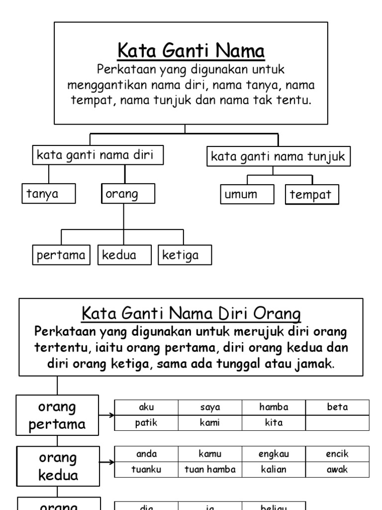 Kata ganti nama diri terbahagi kepada tiga iaitu kata ganti nama diri pertama kata ganti nama diri kedua dan kata ganti nama diri ketiga. Kata ganti tanya ialah perbuatan untuk menggantikan nama benda orang tempat masa bilangan dan hal dengan maksud pertanyaan. Apa merujuk kepada benda atau perkara. Mana merujuk kepada benda atau orang.