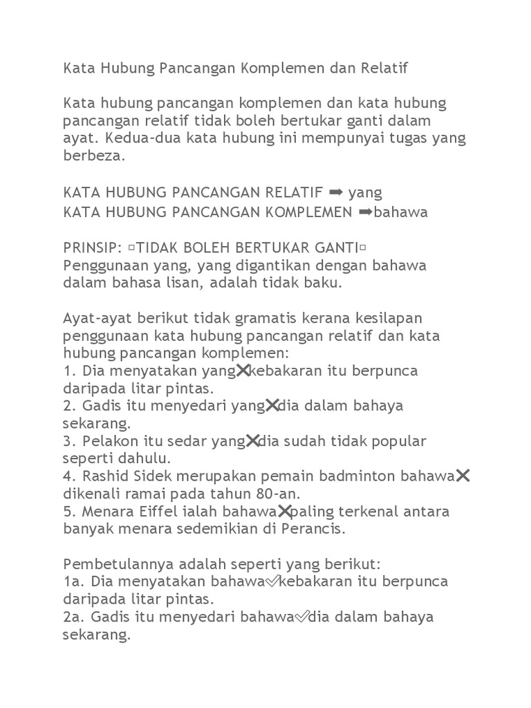 Ayat ayat berikut tidak gramatis kerana kesilapan penggunaan kata hubung pancangan relatif dan kata hubung pancangan komplemen. Kata hubung yang berperanan begitu ialah bahawa dan untuk. Cerpen kasut kelopak jantung mengisahkan cikgu harun yang menerima bungkusan hadiah setiap tahun. Siri tatabahasa bahasa melayu kata hubung pancangan relatif slideshare uses cookies to improve functionality and performance and to provide you with relevant advertising.