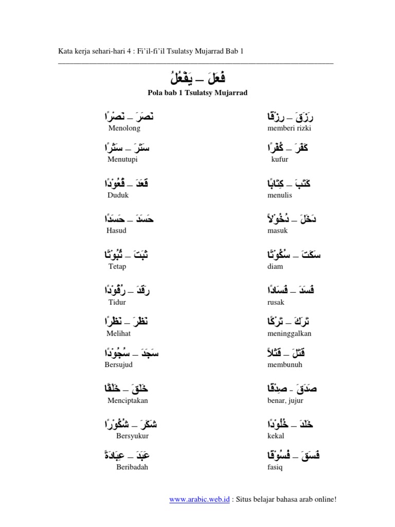 Semoga apa yang telah disajikan bisa bermanfaat dan menambah kemampuan berbahasa arab anda. Kosa kata bahasa arab tentang kata kerja sehari hari م ع ن ى arti ا م ر م ض ار ع م اض ر ق م tidur ن م ي ن ام ن ام 1 bangun tidur ا س ت ي ق ظ ي س ت ي ق ظ ا س ت ي ق ظ 2 menyapu ا ك ن س ي ك ن س ك ن س 3. Isim dalam bahasa indonesia disebut kata benda fi il adalah kata kerja dan harf ialah huruf. Berikut ini saya tuliskan beberapa kosakata bahasa arab kata kerja fi il.