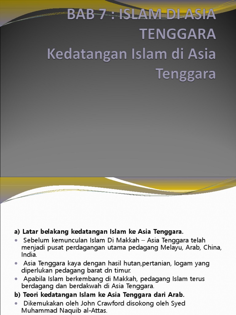 A latar belakang kedatangan islam ke asia tenggara. Institusi kesultanan diperkenalkan. Sistem birokrasi barat di asia tenggara 2 sistem feudalisme 1 sistem pendidikan di acheh 1 sistem pentadbiran selepas kedatangan islam 1 sistem pentadbiran tanah sebelum kedatangan british 1 sistem perundangan dalam tamadun india 1 sistem perundangan zaman dinasti chin dan dinasti han 1 sistem tulisan dalam tamadun awal 1. Walaupun raja pattani diislamkan pada aband ke 15 tetapi islam telah berkembang ke pattani sejak abad ke 10 lagi dengan kedatangan para pendakwah serta pedagang islam arab dan parsi ke pattani.