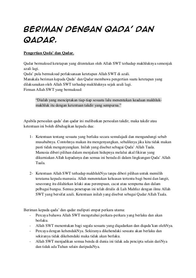 Adalah zatyang maha kuasa di seluruh alam ini untuk menentukan dan mengatur sesuatu yang adadi alam ini dengan kebijaksanaan dan kehendak nya sendiri tanpa diganggui oleh sesuatukuasa asing dengan erti kata yang lain sesuatu perkara yang telah berlaku atau. Beriman kepada qada dan qadar akan melahirkan sikap optimis tidak mudah putus asa sebab yang menimpanya ia yakini sebagai ketentuan yang telah allah takdirkan kepadanya dan allah akan memberikan yang terbaik kepada seorang muslim sesuai dengan sifatnya yang maha pengasih dan maha penyayang. Kalau kita melihat qada menurut bahasa artinya ketetapan. Orang beriman pada qada dan qadar akan tetap tabah sabar dan tidak mengenal putus asa pada saat mengalami kegagalan karena menyadari bahwa semua sudah ditetapkan oleh allah.