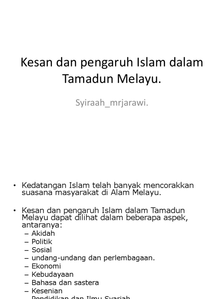 Kesan dan pengaruh islam dalam tamadun melayu dari segi ekonomi. Sultan juga bertanggungjawab mempastikan pentadbiran dapat dijalankan dengan baik dan berkesan. Prinsip pegangan dalam ekonomi islam ialah allah s w t sebagai empunya mutlak segala harta kekayaan manusia pula bertindak sebagai pihak pengusaha yang menjalankan amanah dengan baik mengamalkan dasar terbuka tolong menolong dan bekerjasama dalam masyarakat. Budaya cara hidup dan pemikiran turut mempengaruhi orang melayu. Sultan juga bertanggungjawab mempastikan pentadbiran dapat dijalankan dengan baik dan berkesan.