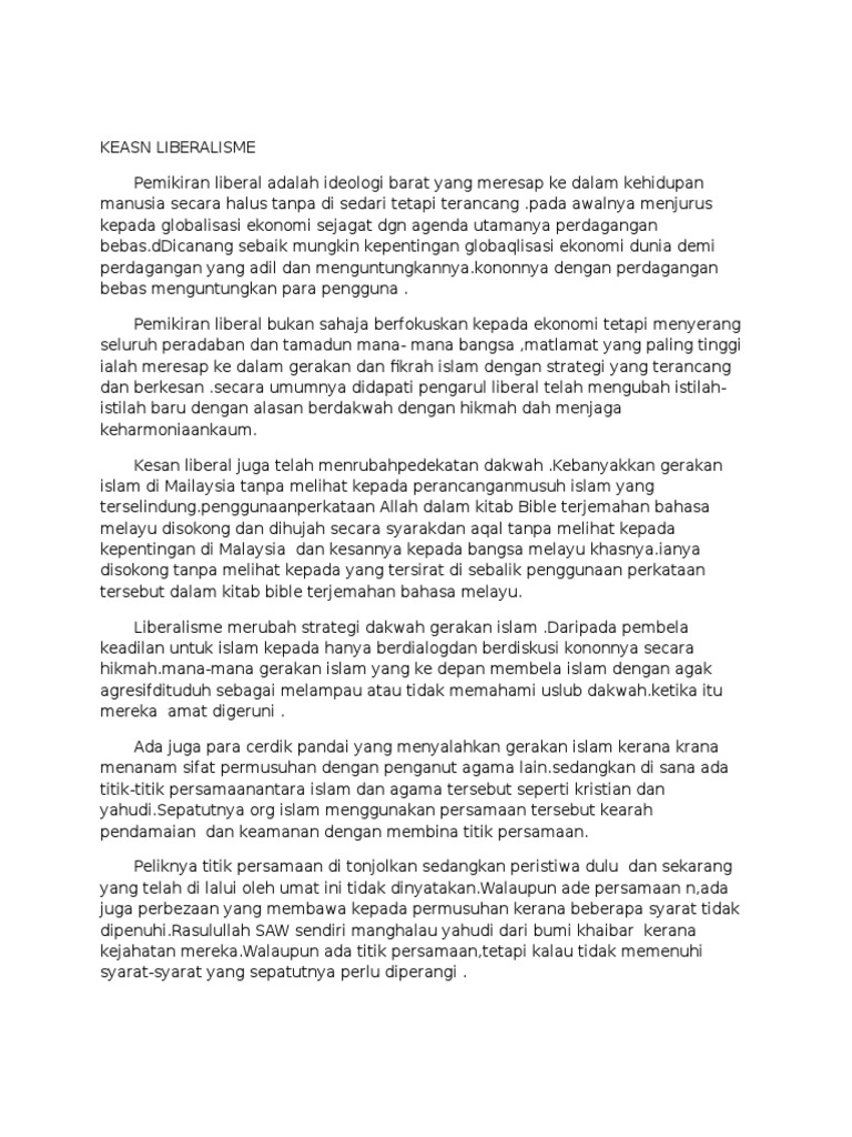 Kesan liberalisme terhadap umat islam. Jika tidak ditangani dengan segera tidak mustahil fahaman. Idea liberalisme dan gagasan kebebasan. Dalam pada itu ter dapat juga segelintir pihak yang tidak menyedari bahawa mereka turut. Walaupun buku buku ini.