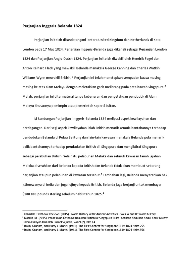 Walau bagaimanapun ketegangan hubungan ini berjaya diselesaikan melalui perjanjian inggeris belanda di london pada 17 mac 1824. Dengan ditandatanganinya perjanjian inggris belanda 1824 ini maka kepulauan hindia terbagi atas pengaruh dua kekuasaan tersebut maka status singapura malaka dan kawasan utara termasuk pulau pinang menjadi hak milik inggris telah dikukuhkan. Persaingan kuasa di antara belanda dengan. Perjanjian inggeris belanda 1824 juga dikenali sebagai perjanjian london 1824.