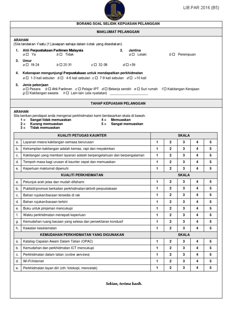 Kepuasan pelanggan merupakan kunci kepada sesebuah perniagaan mustafa et al 2007 yang mana kepuasan dalam penerimaan sesebuah perkhidmatan akan dinilai oleh pelanggan. 7594 tuan puan dialu alukan untuk memberi maklum balas terhadap kualiti perkhidmatan yang disediakan oleh jabatan pendaftar. Borang soal selidik kajian kepuasan pelanggan terhadap perkhidmatan jabatan pendaftar.