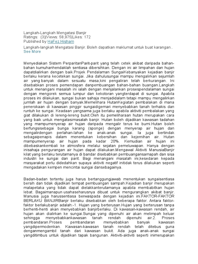 Bahagian a i baca petikan di bawah dengan teliti. Banjir kilat yang berlaku terutamanya di bandar disebabkan pembuangan samapah dan sisa industri ke sungai dan parit. Contoh karangan cara cara mengatasi masalah banjir klat sejak belakangan ini beberapa kawasan di negara kita sering dilanda banjir kilat. Ahli dewan undangan negeri adun lanchang datuk seri mohd sharkar shamsuddin berkata kejadian sama yang turut dianggap besar pernah berlaku dengan kali terakhir pada 2007.