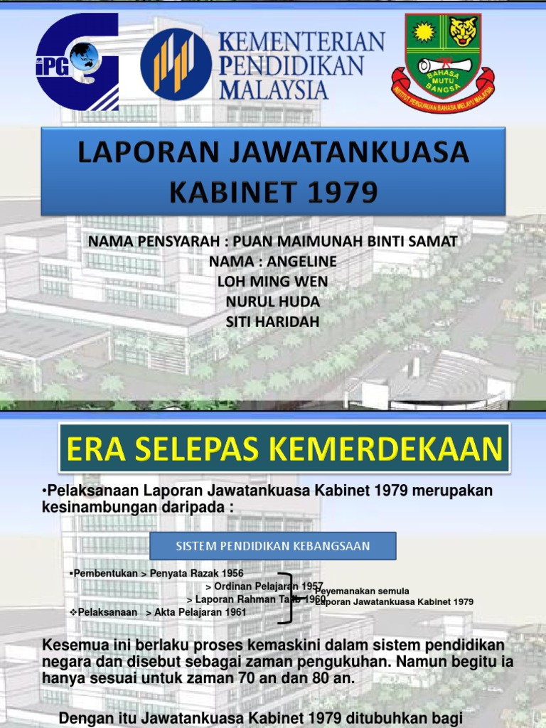 Laporan jawatankuasa kabinet 1979 secara. Laporan jawatankuasa kabinet 1979 dibentuk adalah hasil daripada maklum balas dan laporan daripada jawatankuasa kabinet tahun 1974. 2 tahun 1977 dan pegawai pegawai yang telah dilantik atau dinaikkan pangkat ke jawatan jawatan yang berkenaan sebelum tarikh kuatkuasa opsyen pada 1 7 77. Kementerian pelajaran malaysia 1979.