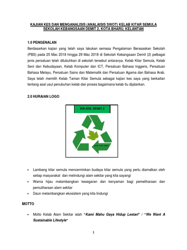 Laporan kajian kes kelab taman kitar semula sekolah. Purwokerto banyumas jawa tengah disusun dan diajukan guna memenuhi laporan hasil penelitian. Kajian kes persatuan. Tujuan analisis swot tujuan dari analisis swot adalah untuk menemukan aspek aspek penting dari kekuatan kelemahan peluang dan ancaman di dalam suatu perusahaan atau organisasi.