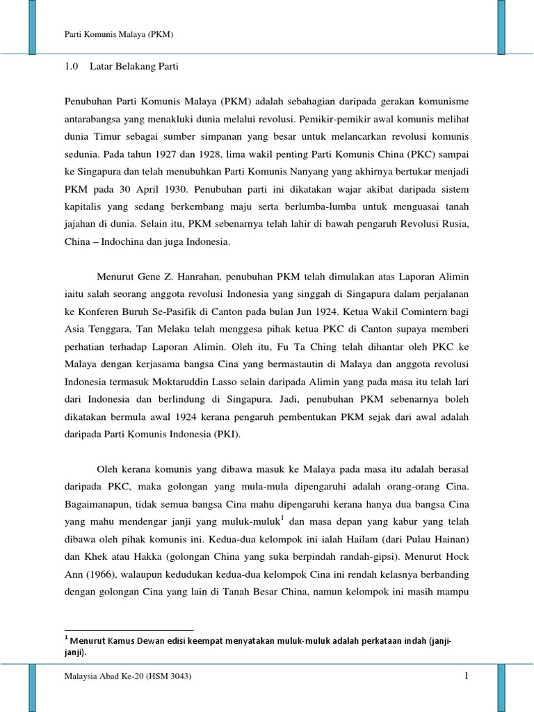 Penubuhan parti komunis malaya pkm adalah sebahagian daripada gerakan komunisme antarabangsa yang menakluki dunia melalui revolusi. Parti komunis malaya pkm 1 0. Perkembangan pkm 1930 1941 pkm telah diarah untuk menyelia gerakan komunis di thailand dan indonesia selain menumpukan kegiatannya di semenanjung tanah melayu. Parti komunis malaya b inggeris.