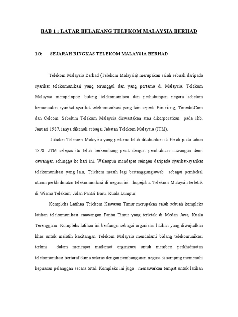 Telekom malaysia bhd. Sejarah telekom malaysia jabatan telekom bermuda di negeri perak pada tahun 1874 oleh j w w birch. Latar belakang telekom malaysia permintaan terhadap perkhidmatan telekomunikasi pada masa kini terus berkembang pesat. Latar belakang telekom malaysia permintaan terhadap perkhidmatan telekomunikasi pada masa kini terus berkembang pesat.