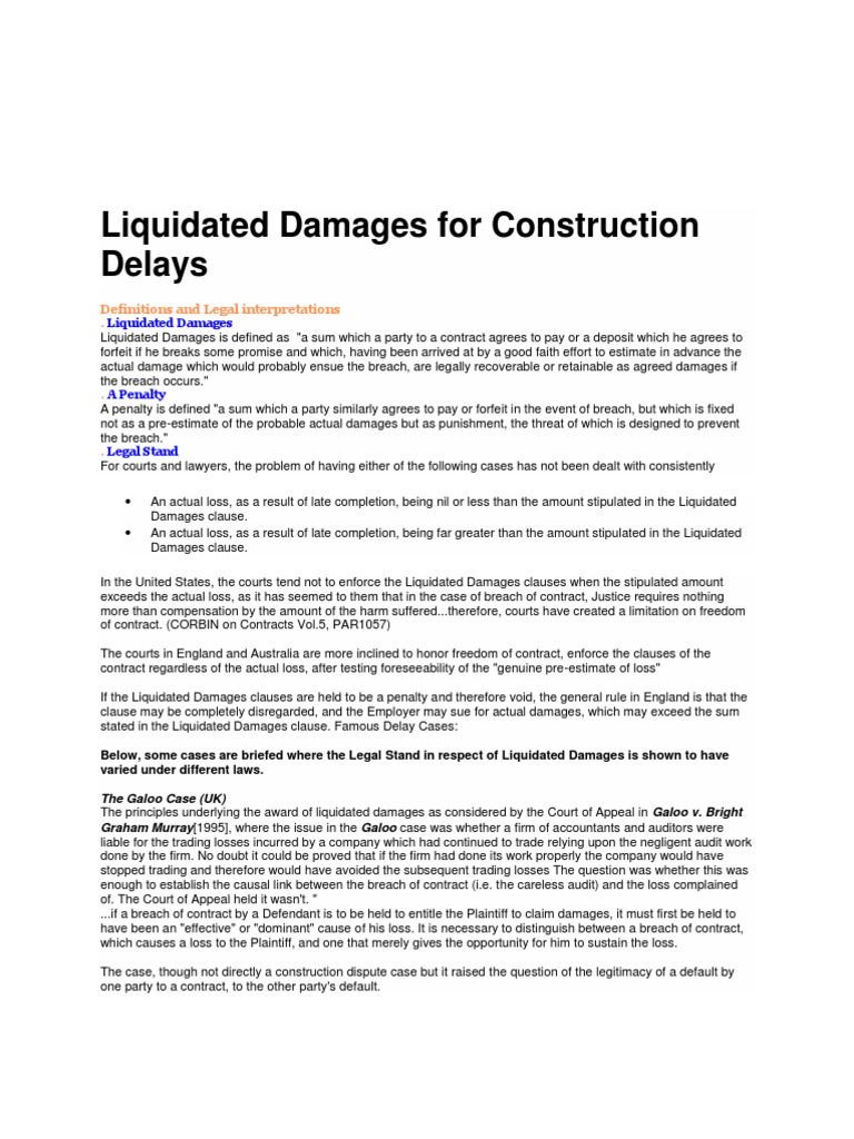 The principal challenges with liquidated damages clauses are that in many instances unless the clause seeks to compensate the operator for its lost profits for the remainder of the operating term of the agreement the operator will be limiting the damages to which it is entitled. Liquidated v unliquidated damages designing buildings wiki share your construction industry knowledge. In common law in order for a liquidated damages clause to be upheld two conditions must be met. This alert is principally concerned with construction contracts where the breach to which lads are most commonly applied is failure by the contractor to complete the works on time although lads can also be applied to other breaches such as failure to meet specified performance targets.