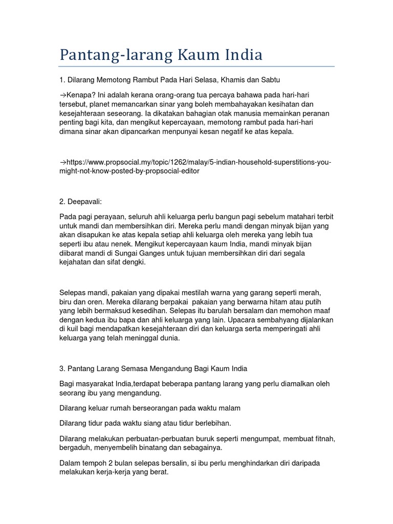 Malaysia merupakan salah satu negara yang mempunyai pelbagai kaum dan kaya dengan pelbagai budaya dan tradisi. Pantang larang selepas bersalin menekankan pemulihan dan rawatan tubuh badan yang diperlukan oleh ibu. 5 pantang larang kaum india yang mungkin tidak diketahui ramai 5. 7 jenis makanan yang perlu dielakkan semasa dalam pantang 1.