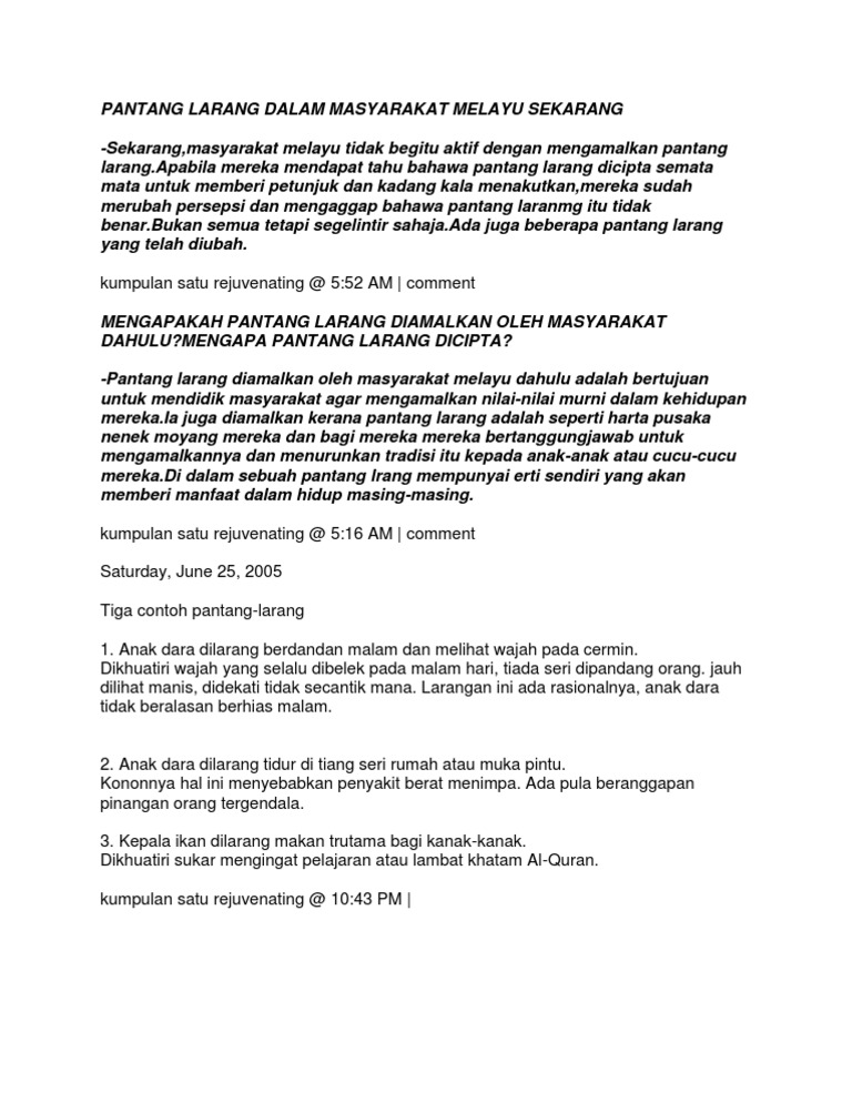 Info adat yg lengkap serta berguna. Pantang larang dan ada antaranya mempunyai sebab pantang larang wujud. Adalah agar seseorang. Ia juga merupakan undang undang atau hak yang tak tertulis dalam sesebuah masyarakat.