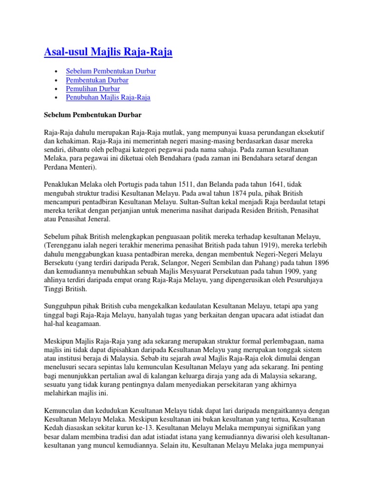 Pembentukan durbar pada 1 julai 1896 pihak british membentuk negeri negeri melayu bersekutu dan menetapkan dengan serta merta bahawa suatu mesyuarat antara raja raja melayu dengan pihak british hendaklah diadakan bagi mengenal pasti masalah yang dihadapi oleh negeri negeri tanah melayu. Ahli ahli durbar tanggungjawab raja raja melayu sebagai pelindung orang melayu dalam majlis mesyuarat persekutuan i. Pendahuluan negeri negeri melayu bersekutu merupakan gabungan 4 buah negeri di tanah melayu iaitu perak negeri sembilan selangor dan pahang yang telah disatukan dalam satu pentadbiran berpusat. Pendapat ini disokong oleh ahli sejarah seperti a c.