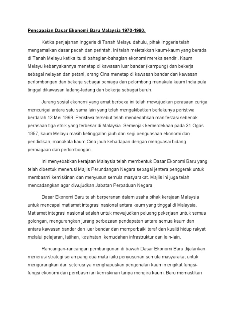 Pencapaian dasar ekonomi baru deb. Pencapaian dasar ekonomi baru deb selepas peristiwa 13 mei 1969 kerajaan telah mengusahakan satu rancangan pembangunan negara yang melibatkan program 20 tahun yang dikenali sebagai dasar ekonomi baru deb. 2 pembasmian kemiskinan dengan penyediaankeperluan asas dan mutu kehidupan secara keseluruhan dengan pengenalan deb didapati mutu kehidupan masyarakat bertambah baik. Sahaja lagi tempoh masa deb pencapaian deb hingga kini tidaklah begitu memuaskan seperti yang dirangkakan. Selain itu rancangan ini juga bertujuan untuk menyusun semula ketidakseimbangan sosio ekonomi yang wujud di negara ini.