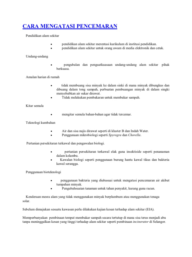 Pencemaran dan cara mengatasinya. Pencemaran air berdampak luas misalnya dapat meracuni sumber air minum meracuni makanan hewan ketidakseimbangan ekosistem sungai dan danau pengrusakan hutan akibat hujan asam dan sebagainya. Mereka akan terus melakukan pencemaran dan membayar denda yang kecil. 10 penyebab pencemaran lingkungan dan cara mengatasinya pencemarahan lingkungan saat marak terjadi hal tersebut tak lepas dari aktivitas manusia dalam kesehariannya pencemaran lingkungan tidak bisa dianggap sebagai hal sepele karena lingkungan yang tercemar bisa menganggu keseimbangan ekosistem yang ada. Keadaan ini disebabkan oleh pelbagai kelemahan dan kekangan dalam melaksanakan langkah langkah tersebut.