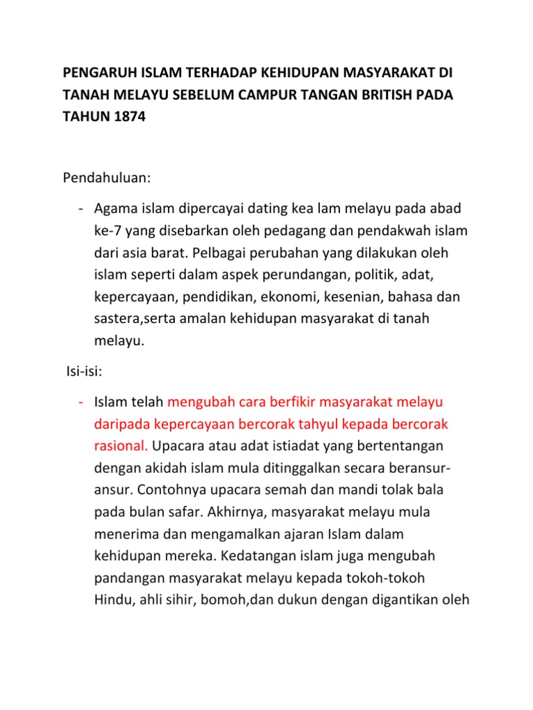 Pengaruh islam dalam kebudayaan sebagai ajaran yang lengkap islam turut membawa transformasi dalam aspek sosial di alam melayu unsur unsur kekastaan semakin terhakis diganti dengan sistem keadilan dan persamaan sesama insan wertheim berkata islam telah menaikkan harga diri golongan bawahan yang selama ini tertindas dan terhina dalam sistem hindu. Di antara cara hidup yang terpenting yang berhubung rapat dengan ad din ialah masjid abdul rahman 1981. Kepulauan melayu atau nusantara merangkumi daerah daerah atau kepulauan semenanjung tanah melayu indonesia filipina vietnam dan taiwan hingga ke madagascar. Agama islam mempunyai pengaruh yang besar ke atas masyarakat tempatan di tanah melayu dari segi politik sosial dan ekonomi.