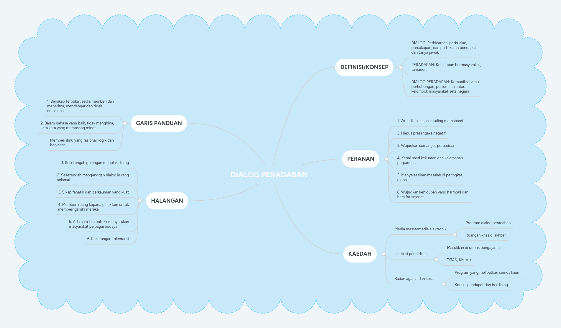 Peranan dialog antara tamadun. Peranan dialog boleh diperlihatkan dalam pelbagai perkara khususnya dialog antara agama. Dialog dalam kehidupan seharian telah pun berlaku melalui proses bekerjasama berkomunikasi dan hidup bersama dalam pekerjaan persekitaran sekolah hospital dan sebagainya. Dialog antara tamadun antara civilizational dialogue dialog antara tamadun dialogical civilization tamadun yang sedia berdialog 10. Beberapa prinsip dialog perlu diambil perhatian dalam usaha ke arah mewujudkan perpaduan dan persefahaman antara tamadun atau kaum.