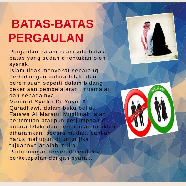 Poster batas batas pergaulan. Dalam syariat islam ada sesetengah hukum atau peraturan berbeza di antara lelaki dan perempuan dan ada yang tidak berbeza. Allah s w t mencipta manusia lelaki dan perempuan. Tawuran adalah salah satu tindakan kekerasam antar sesama geng sekolah dalam kehidupan urban indonesia. Poster tentang pergaulan bebas.