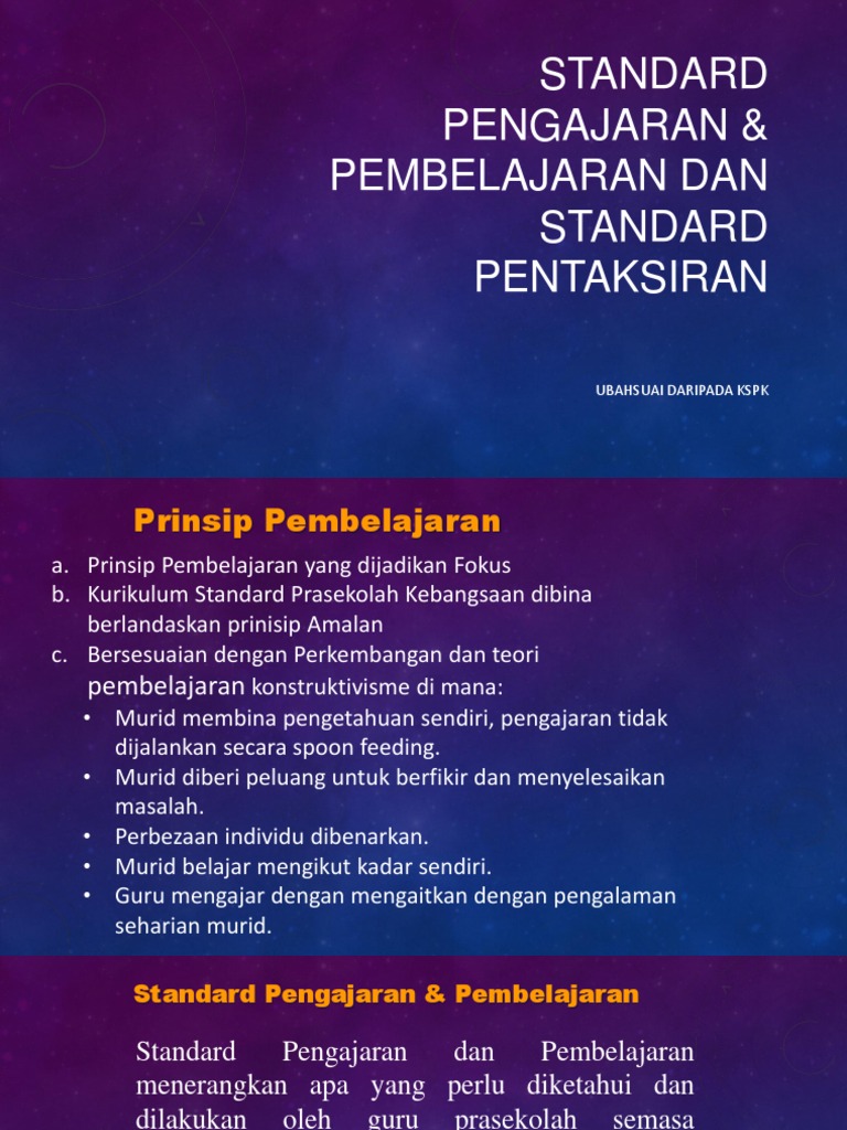 Prinsip pembelajaran yangdijadikan fokuskurikulum standard prasekolah kebangsaan dibinaberlandaskan prinisip amalan bersesuaian denganperkembangan dan teori pembelajaran konstruktivismedi mana murid membina pengetahuan sendiri pengajaran tidakdijalankan secara spoon feeding murid. Pengenalan transformasi kurikulum standard prasekolah kebangsaan nota. Kurikulum prasekolah kebangsaan dibangunkan berasaskan standard kandungan dan standard pembelajaran yang perlu dicapai oleh murid. Kurikulum standard prasekolah kebangsaan kspk yang dilaksanakan pada tahun 2010 telah disemak semula bagi memenuhi tuntutan dasar baharu di bawah pelan pembangunan pendidikan malaysia pppm 2013 2025 dan keperluan semasa.