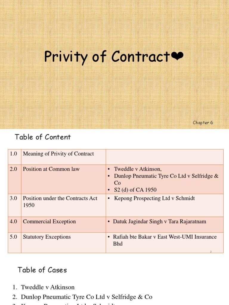 In malaysia the development of doctrine privity contract in malaysia begin with the first case in malaysia court which is kepong prospecting ltd v schmidt 8. 3 besides the high court in australia and the supreme court in canada had also created exceptions to the privity rule. T here appears to be no rule in malaysia that a person who is alien to the consideration. The reasoning behind this goes as follows if the promisor to the main contract promises the third party that he will perform his obligations under the main contract then a collateral contract exists.